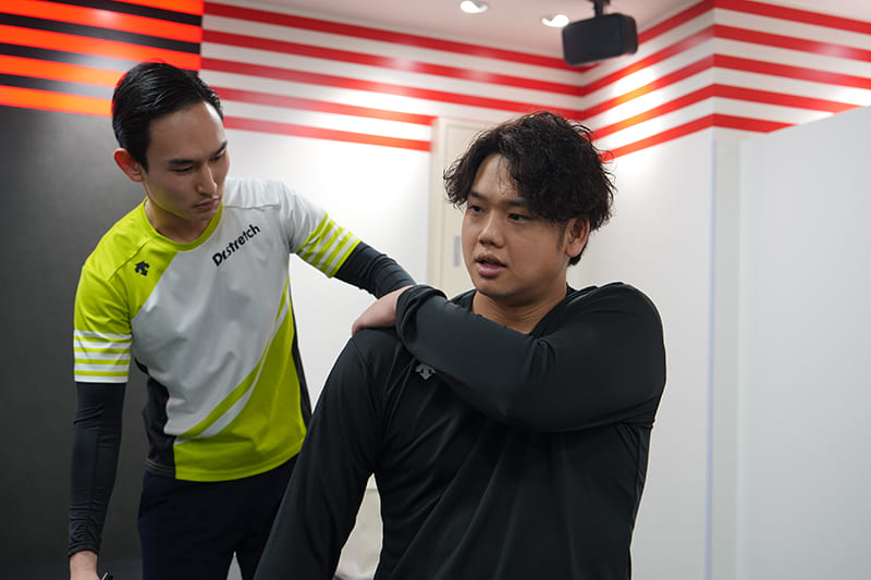「さすがスポーツ選手、肩周りの筋肉量がかなり多いです」と見浪トレーナー。「ストレッチする際の脱力もすごくうまいですね」とほめてくれます。