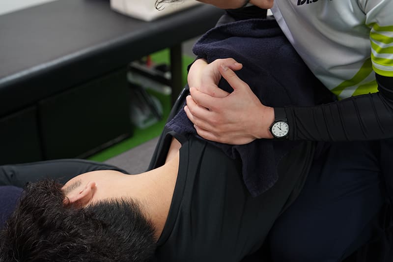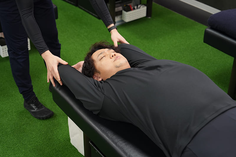 リラックスムードの中でも、肩の硬さや可動域をチェックしながら進める見浪トレーナー。 -