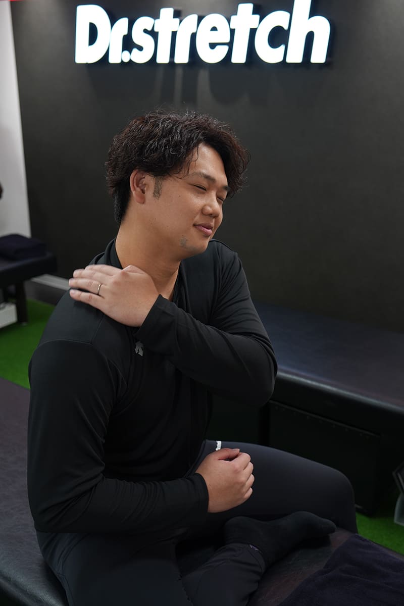 最近は野球のジュニアチームで指導し、子どもたちとボールを投げ合う機会が多い谷口さん。引退後はプロの手を借りてケアをすることが少なくなったせいか、肩周りにお悩みを感じているそうです。